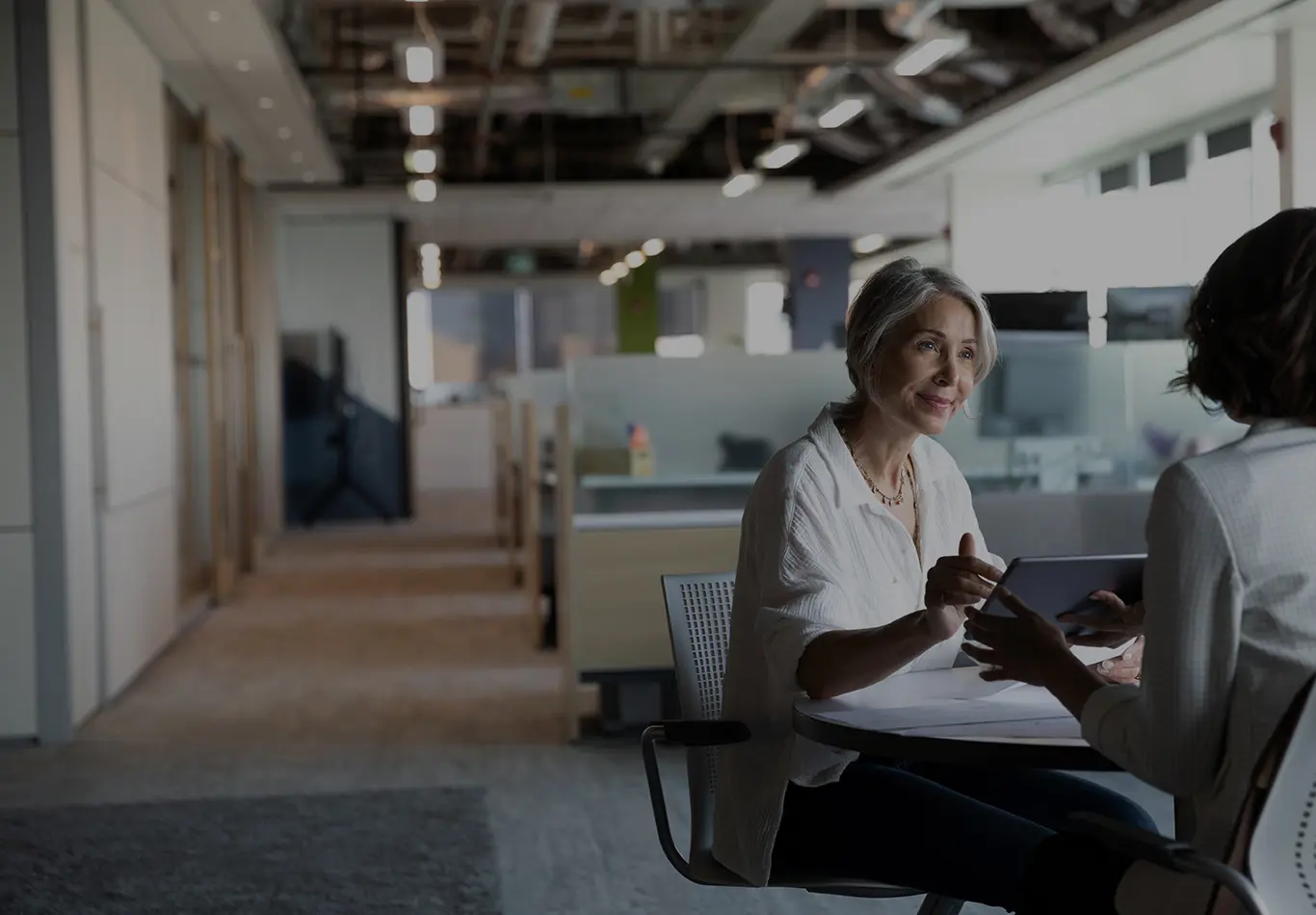 Two people are sitting at a table together. One person in a grey shirt has papers in front of them and the other person in a blue shirt is holding a tablet and has a computer in front of them